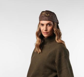 With its flexible material that feels like peach skin, this duckbill cap elegantly evokes the patina of aged leather. Its deep brown finish is subtly enlivened by a golden crackled pattern embroidered at the back, a nod to the art of kintsugi, where imperfection becomes precious.