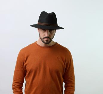 Traveller realized in wool felt. Its classic and adventurous look will be timely for walks. At the same time, it will protect our head under its comfortable crown and wide brim, capable of protecting from the sun. Its brim is turned downwards and adds to the whole a dynamic touch, a little bit mysterious.
