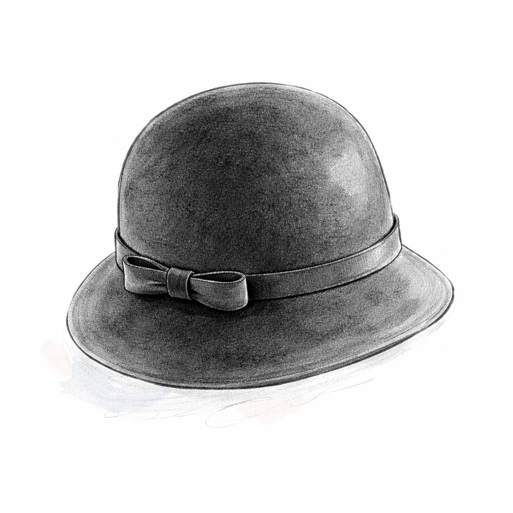 The Cloche Hat derives its name from its unmistakable shape. A rounded crown, enveloping, extended by short, drooping brims that gently descend over the forehead.