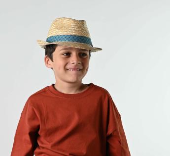 Trilby hat for kids designed with sewn straw. It is embellished by bma braid of geometric patterns. The band of the garniture is limited by a denim fabric for better highlighting the brand's badge. The teardrop crown is dominating a brim that was let short.