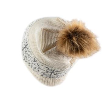 Nordic look and cocooning spirit for this beanie knitted in France from a soft blend of wool, acrylic, and lurex. Its graphic pattern adds depth, while the slightly shimmering thread subtly illuminates the whole. The faux fur pompom adds an elegant and warm touch, perfect for the cold season.