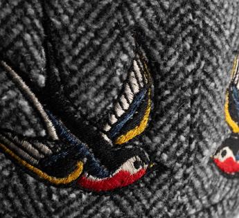 Flat cap with a subtle herringbone pattern, this piece blends authenticity with powerful symbolism. Water resistant and lined for added comfort, it is adorned with two swallow embroideries crafted in France—a nod to old school tattoo art. As a symbol of return, loyalty, and attachment to home, the swallow brings a poetic touch to this original creation.