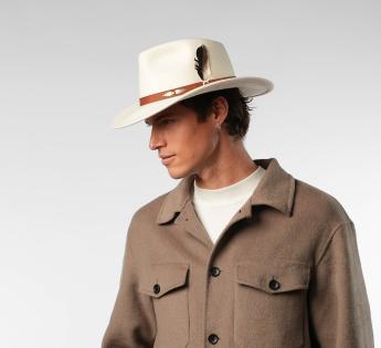 With its slightly upturned side brims and assertive silhouette, this hat revisits the cowboy style with a contemporary touch. The crown, carved with smooth lines, is complemented by a leather braid adorned with embroidery and a removable natural feather.