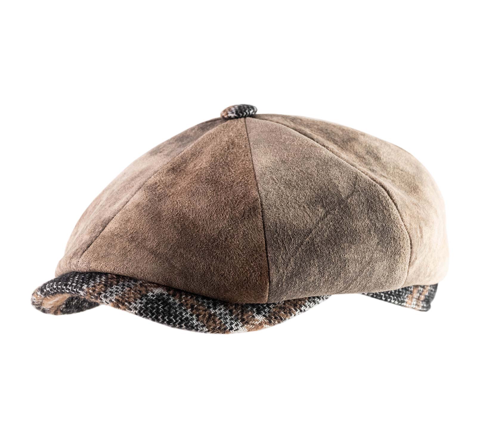 Flat cap with a crown made of 8 panels of suede leather (very soft reversed leather), which adds a charming touch. A play of textures is noticeable between the visor, the top part of the cap, and the snap button.