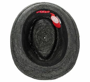 Trilby shape adorned by a grosgrain with herringbone patterns. The garniture is adding an ultra graphic note thanks to the three colors used. It is finished by a satin knot and with leather details to bring texture.