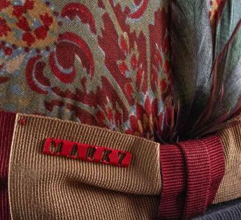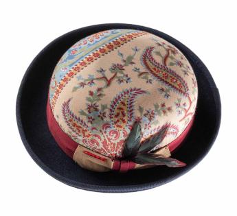 A standout piece in a limited edition, this Bowler Hat covered in vintage paisley fabric is distinguished by its unique allure. Each piece features a different pattern placement, making each hat truly singular. A carefully crafted trimming, enhanced with a two-tone braid and a rooster feather with green and burgundy hues, signs an audacious and refined silhouette.