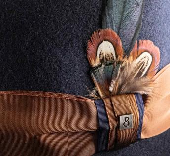 Its compact and refined shape is enhanced by a satin bow, accented with a subtle feather, evoking understated sophistication. The lightness of the felt offers unparalleled comfort, while the crafted band ensures a perfect fit, blending tradition and innovation.