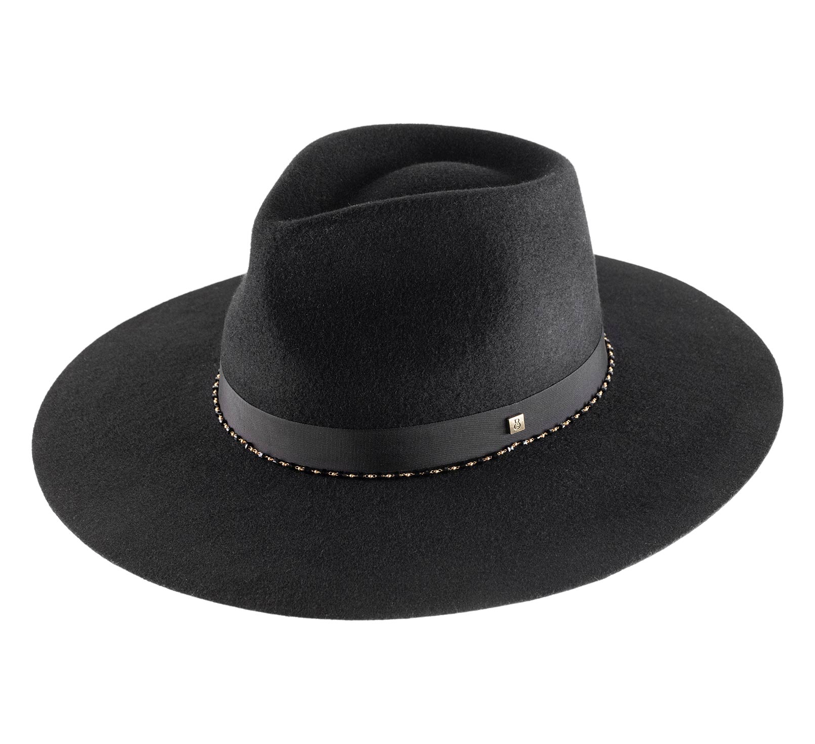 The matching grosgrain trim is enhanced with a delicate chain adorned with tiny pearls, creating a discreet jewel-like detail that elegantly illuminates the hat. The metallic emblem adds a signature touch to this exceptional model, while the matching satin lining ensures impeccable comfort. This fedora is the centerpiece of a refined and bold style.
