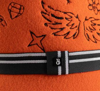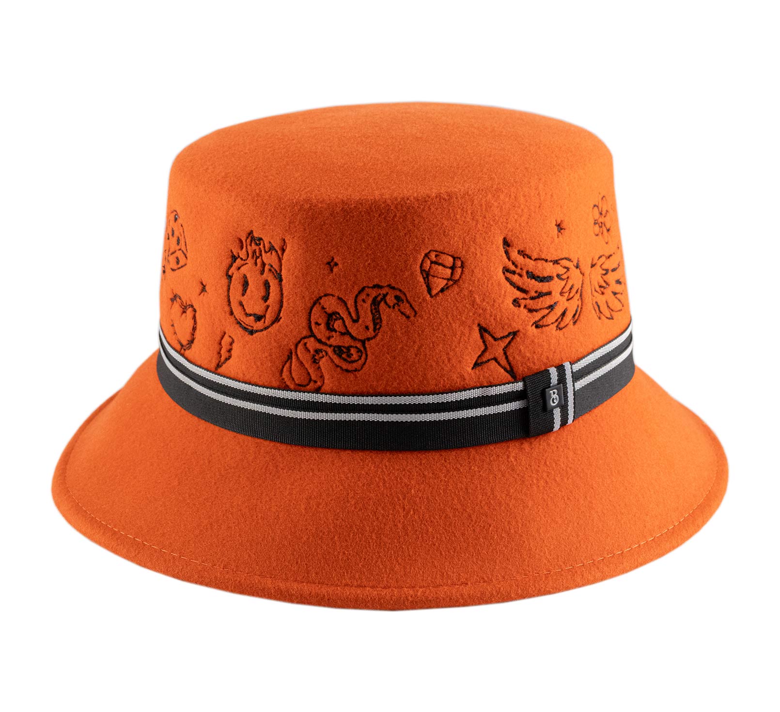 Colorful, bold, and ultra-creative, this wool felt Bucket hat reinvents the codes of headwear. Its flat crown is entirely embroidered with graphic tattoo-like patterns, adding a street and quirky touch. The striped braid structures the ensemble, enhanced by a metallic Label at the center. This model attracts all eyes while asserting true freedom of style.