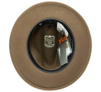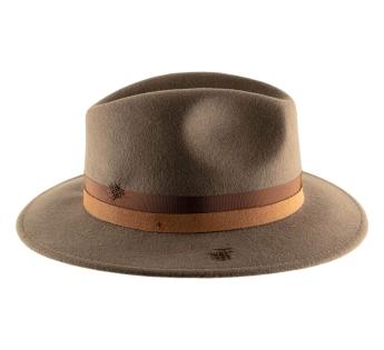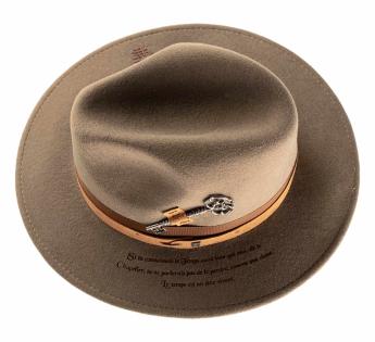 Entirely crafted from dense and structured wool felt, this model revisits the classic Outback Hat shape through a symbolic aesthetic inspired by the poetic universe of Lewis Carroll. An ancient key, fixed in place of the traditional feather, becomes the emblem of the mystery of time, a direct nod to the Mad Hatter from Alice.