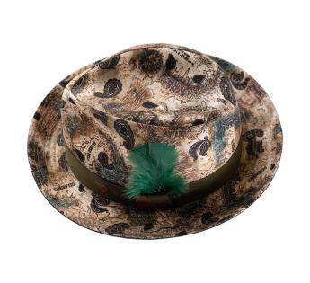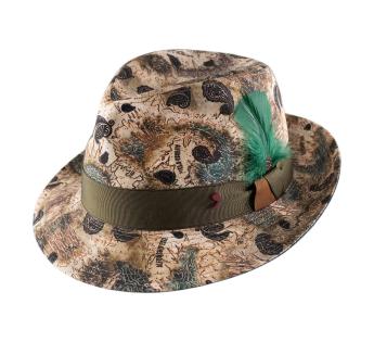 This Alfonso D’Este Player Hat is more than just an accessory—it is a collector’s piece. Its cartographic print and paisley motifs on fine linen tell a story of refined wanderlust. Accented with a vibrant emerald feather and meticulously crafted finishes, it commands an undeniably artistic presence.