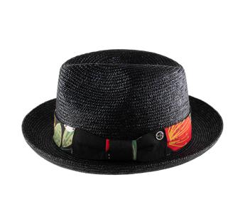 A hat of many facets, dancing with the summer light. Its ribbon, adorned with botanical patterns, plays with abstract, contrasting, and vibrant designs.