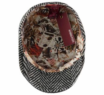 Flat cap with a slight amplitude on the side. Its design is adorned with large herringbone patterns. This model stands out for its elegance and refinement.