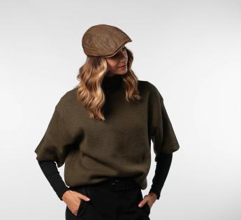 Waxed cotton flat cap. It gives the illusion of aged, patinated leather. Made from a technical fabric that combines the breathability of cotton with the durability of synthetic fibers, its warm color and soft texture give it a timeless character, perfect for those seeking an authentic yet refined style. The discreet metal emblem on the side emphasizes the quality and attention to detail.