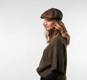 This flat cap is made from high-quality aged leather, offering an elegant and timeless look. Its textured surface, featuring shades of brown, adds character and authentic charm.