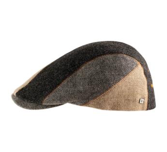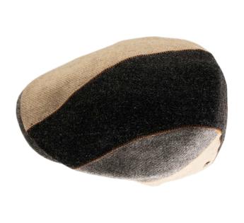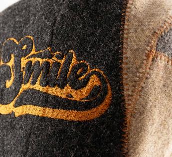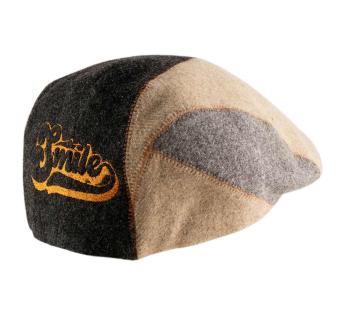 A patchwork of materials and style: this Flat cap in virgin Shetland wool offers a fitted and dynamic cut, enhanced by a play of contrasting panels subtly highlighted by visible topstitching. At the back, an embroidered 'Smile' adds a strong graphic touch, crafted on demand in our Lyon workshop.
