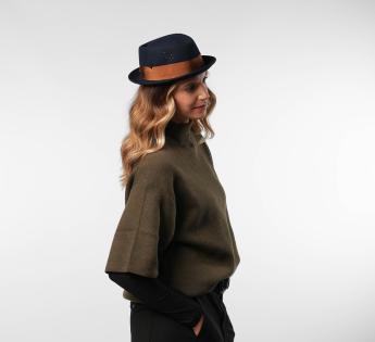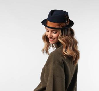 This porkpie reinterprets the codes of the classic with a touch of boldness. Crafted from a beautifully dense wool felt, it reveals a deliberately patinated look, almost cinematic.