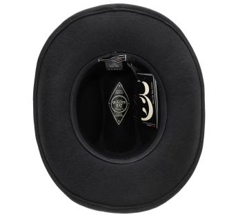 Raw charisma and western allure for this cowboy hat crafted in our Lyon workshop. Its high-quality felt protects you from gusts as well as morning chills. Its high flat-topped crown and slightly upturned wide brim evoke the authenticity of the great outdoors. Fine embroidery on the top, a nod to the codes of the Far West, for a refined and distinguished finish.